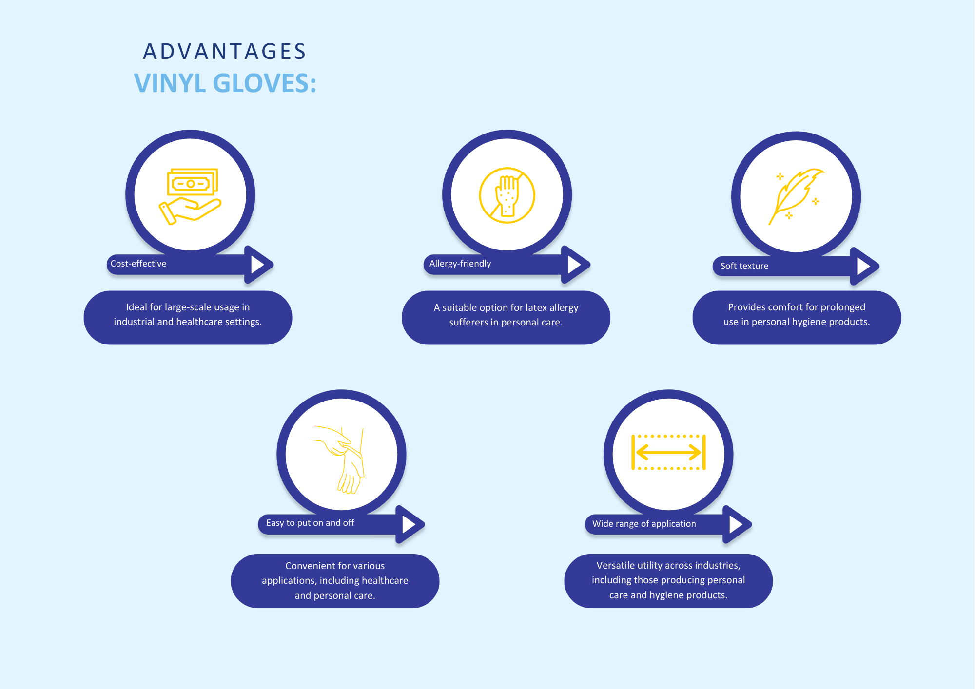 Vinyl gloves are cost-effective and offers basic protection. They are versatile and suitable for industries requiring personal care and hygiene products.
